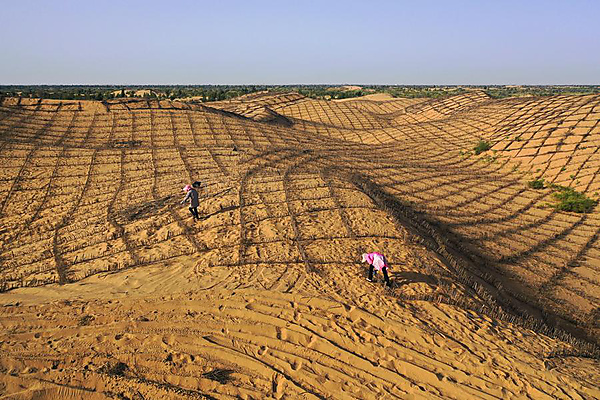 A drone photo taken on Sept. 12, 2025 shows workers laying sand barriers at Kubuqi desert in Hangjin Banner, north China's Inner Mongolia Autonomous Region. [Xinhua/Li Zhipeng] |