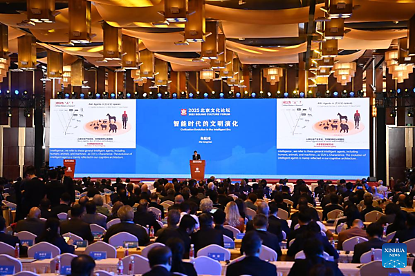 Zhu Songchun, a national political advisor and director of the Beijing Institute for General Artificial Intelligence, delivers a speech titled "Civilization Evolution in the Intelligent Era" during the 2025 Beijing Culture Forum in Beijing, capital of China, Sept. 23, 2025. [Xinhua/Xiao Xiao] |
