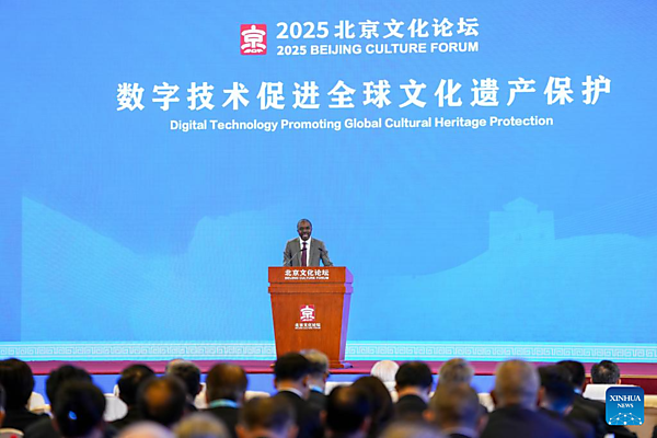Lazare Eloundou Assomo, director of the UNESCO World Heritage Center, delivers a speech titled "Digital Technology Promoting Global Cultural Heritage Protection" during the 2025 Beijing Culture Forum in Beijing, capital of China, Sept. 23, 2025. [Xinhua/Ju Huanzong] |