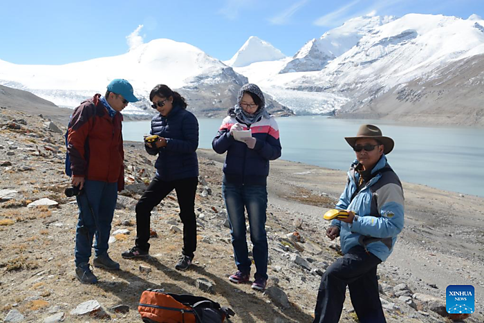 | This undated photo shows meteorologist Tashi Yangzom (2nd L), together with other team members, collecting data in the fields of Xigaze, southwest China's Xizang Autonomous Region. [Xizang Meteorological Bureau/Handout via Xinhua] |