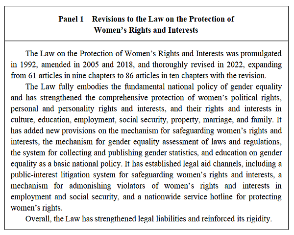 The amended Law on the Protection of Women's Rights and Interests has made more comprehensive and systematic provisions on the system and mechanism for protecting women's rights and interests. China has also formulated the Anti-Domestic Violence Law and created systems of compulsory reporting, admonition, personal safety protection order, and emergent protection.