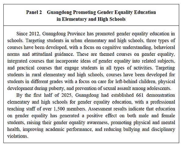 For Party and government leaders, the Implementation of Gender Equality as a Basic National Policy has been compiled as a coursebook and incorporated into the curriculum and teaching plans of Party schools. For students, education on gender equality has been promoted in elementary and high schools, as well as in universities, and integrated into textbook planning and regulatory standards, and guides for related courses. Gender balance is emphasized in textbook illustrations, and excellent female writers have seen greater representation in textbooks, to eliminate gender stereotypes in teaching materials.