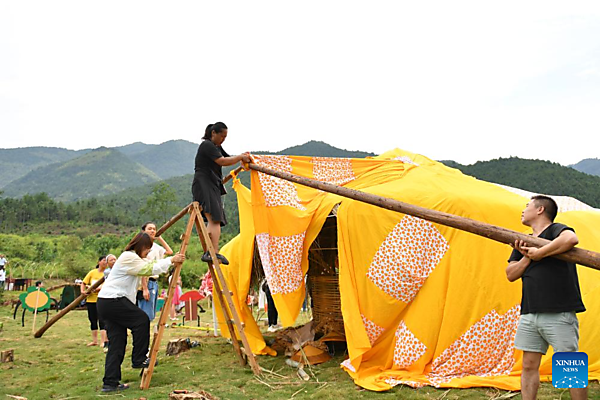 Zhou Yan (L, up), volunteers and villagers set up an artistic house in Dayuan Village of Ningyuan County, central China's Hunan Province, Aug. 20, 2023. [Xinhua/Chen Zhenhai] |