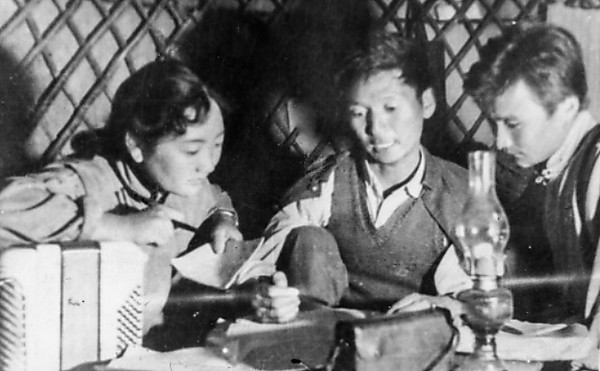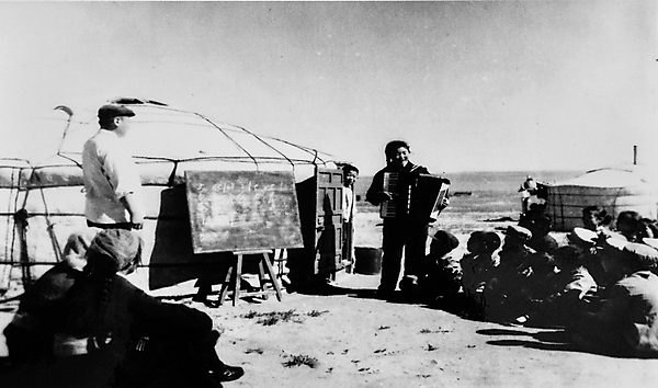 | This file photo shows actors of the Ulan Muqir art troupe teaching children common knowledge in the 1960s. [Xinhua] |