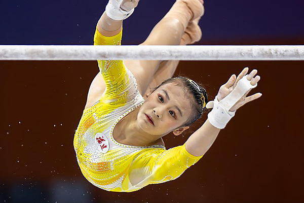 | Qiu competing for Fujian on her way to winning gold in the women's uneven bars final at China's 15th National Games in Zhaoqing, south China's Guangdong Province, on Nov. 16, 2025. [Xinhua/Du Zixuan] |