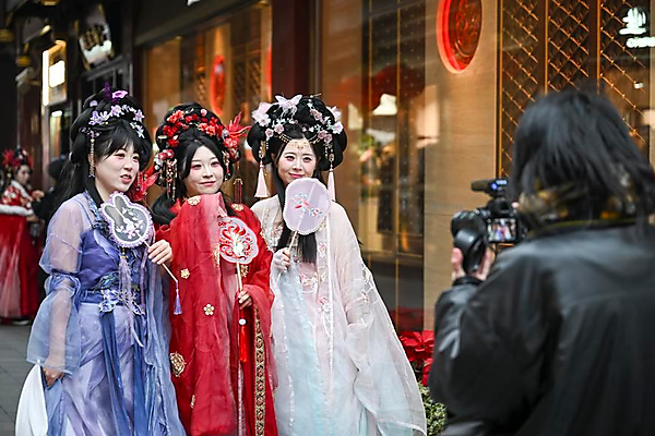| South Korean tourists dressed in Hanfu, a traditional Chinese attire, pose for photos in Yuyuan Garden in Shanghai, east China, Jan. 6, 2026. [Xinhua/Chen Haoming] |