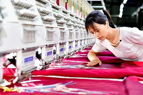 | A staff member monitors the work of embroidery machines in an embroidery enterprise in Caoxian County, east China's Shandong Province, June 19, 2025. [Xinhua/Guo Xulei] |