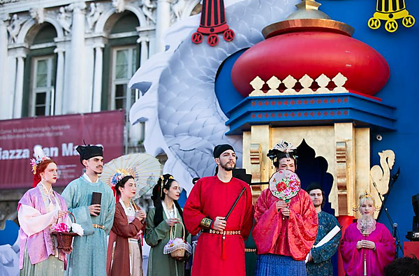 | Italian volunteers display Hanfu, a style of clothing traditionally worn by the Han people, at Piazza San Marco in Venice, Italy, Feb. 13, 2024. [Xinhua/Li Jing] |