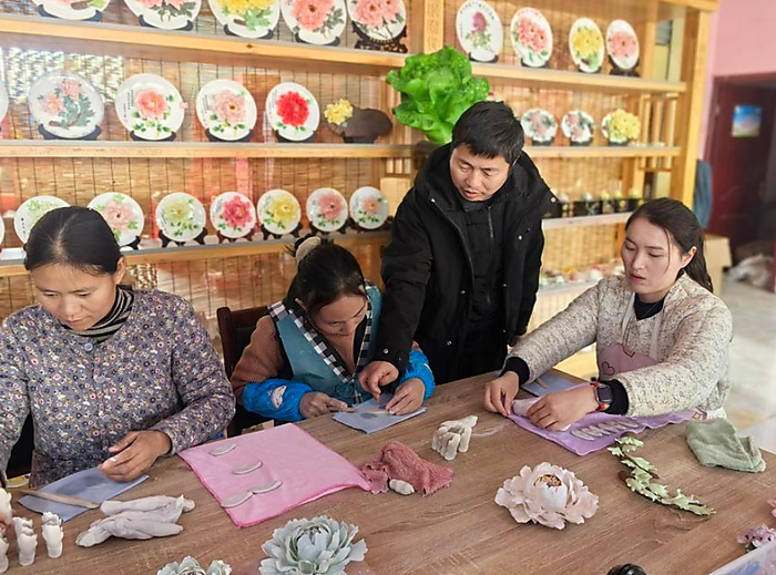 In one workshop, artisan Li Changsuo teaches apprentices how to craft porcelain pieces shaped like peonies. "Heze's peony porcelain combines centuries-old ceramic craftsmanship with local floral culture," Li said, adding that an array of products has been launched for the blooming season.