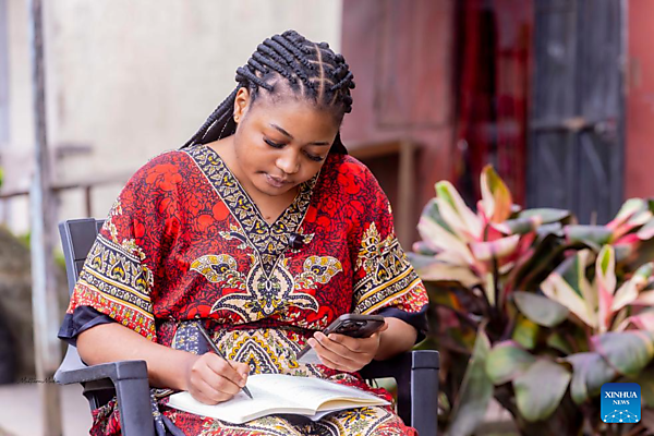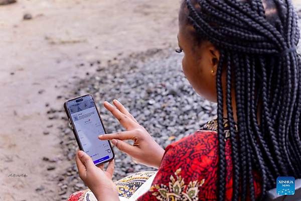 | Elove Marie-Cleophas Messanga makes online purchases and arranges shipments from a Chinese company on her phone in Buea, the chief town of the Southwest Region, Cameroon, on Sept. 20, 2025. [Photo by Muleng Timngum/Xinhua] |