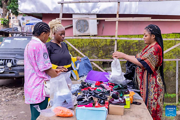 | Elove Marie-Cleophas Messanga (R) displays clothes and shoes sourced from Chinese online platforms to people on a street in Buea, the chief town of the Southwest Region, Cameroon, on Sept. 20, 2025. [Photo by Muleng Timngum/Xinhua] |
