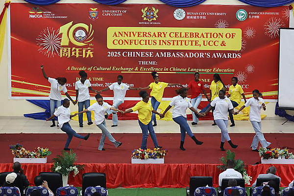 | Students perform during a celebration marking the 10th anniversary of the Confucius Institute at the University of Cape Coast in Cape Coast, capital of Ghana's Central Region, Dec. 15, 2025. [Photo by Seth/Xinhua] |