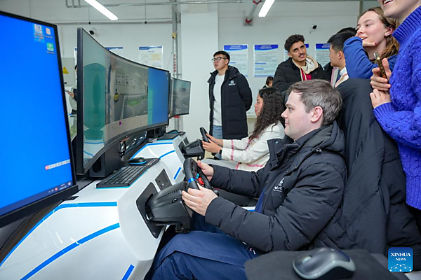 | Chinese and British students visit the future transportation international innovation platform of the School of Transportation Science and Engineering of Harbin Institute of Technology (HIT) in Harbin, northeast China's Heilongjiang Province, Jan. 8, 2026. [Harbin Institute of Technology/Handout via Xinhua] |