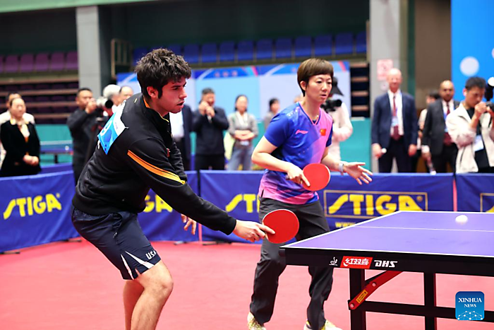 | A China-U.S. table tennis friendly match is pictured in Shijiazhuang, north China's Hebei Province, April 11, 2026. [Xinhua/Lu Ye] |