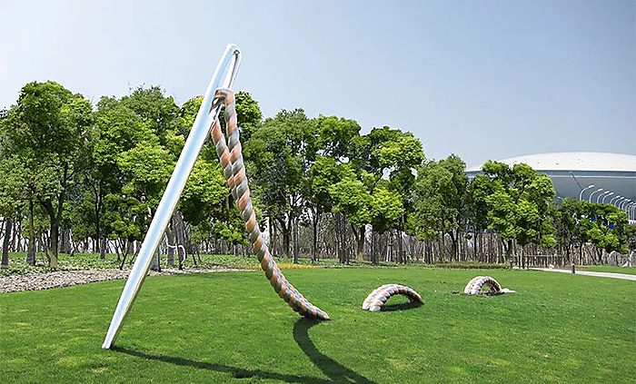 In 2010, Zhou created the colorful, mixed-metal sculpture, Embroidery. A four-meter-high "embroidery needle" pierces the ground, with colorful threads tied to its eye, and two arched stitch marks emerge from the ground. The two stitch marks serve as seats, allowing people to rest and experience the sculpture's approachable charm.