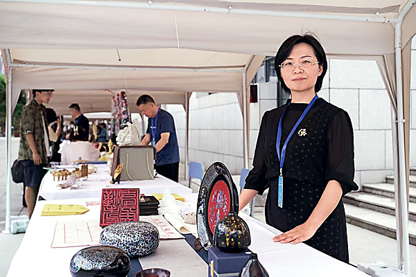 | Ma Jing, a provincial-level representative inheritor of the decoration technique of Jishan-style mother-of-pearl-inlaid lacquerware |