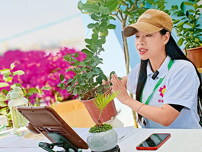 Liu Huahua, also a trainee, says, "I originally disliked being filmed. Encouraged by the women's federation, I gradually overcame my psychological barriers. The professional knowledge, in the course on photography, short-video production and live-streaming techniques, was exactly what I wanted to learn. Now, I can film myself explaining bonsai landscaping, and promoting floriculture products."