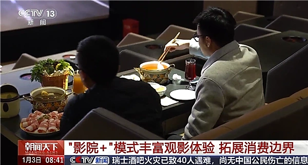 During the three-day New Year holiday, a cinema in east China's Huzhou attracted both film fans and people seeking novelty. Sitting in separate booths, viewers enjoyed steaming hot pot while following the twists and turns unfolding on the big screen.