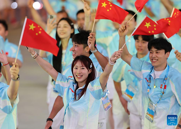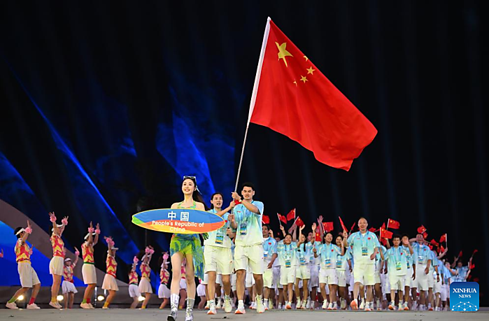 | Members of the delegation of China parade during the opening ceremony of the 6th Asian Beach Games in Sanya, south China's Hainan Province, April 22, 2026. [Xinhua/Zhu Zheng] |