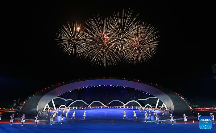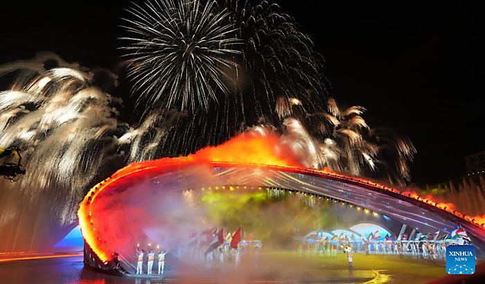 | Fireworks illuminate the sky during the opening ceremony of the 6th Asian Beach Games in Sanya, south China's Hainan Province, April 22, 2026. [Xinhua/Guo Cheng] |