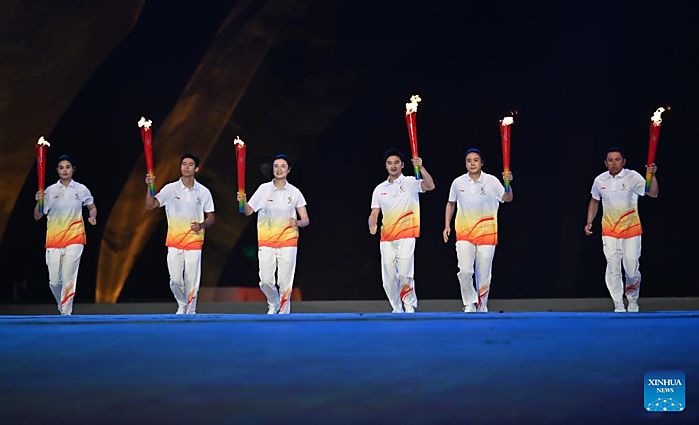 | Torchbearers run with the torch during the opening ceremony of the 6th Asian Beach Games in Sanya, south China's Hainan Province, April 22, 2026. (Xinhua/Zhao Zishuo) |