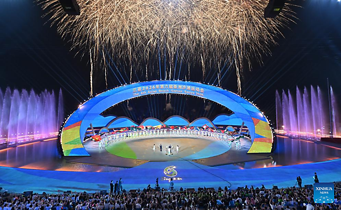 | Photo taken on April 22, 2026 shows the general view of the opening ceremony of the 6th Asian Beach Games in Sanya, south China's Hainan Province. [Xinhua/Guo Cheng] |