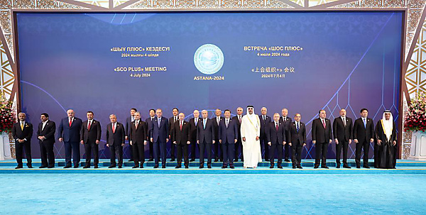 | Chinese President Xi Jinping attends a group photo session during a welcome banquet held by Kazakh President Kassym-Jomart Tokayev ahead of the expanded meeting of the Shanghai Cooperation Organization (SCO), or SCO+, in Astana, Kazakhstan, July 4, 2024. Xi attended the SCO+ meeting and delivered an important speech titled "Joining Hands to Build a More Beautiful Home Of the Shanghai Cooperation Organization" here on Thursday. [Xinhua/Ju Peng] |