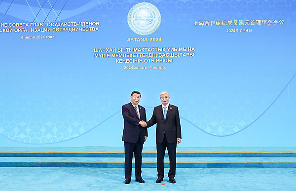 | Chinese President Xi Jinping shakes hands with Kazakh President Kassym-Jomart Tokayev in Astana, Kazakhstan, July 4, 2024. Xi attended the 24th Meeting of the Council of Heads of State of the Shanghai Cooperation οrganization (SCO) at the Independence Palace in Astana Thursday. [Xinhua/Pang Xinglei] |