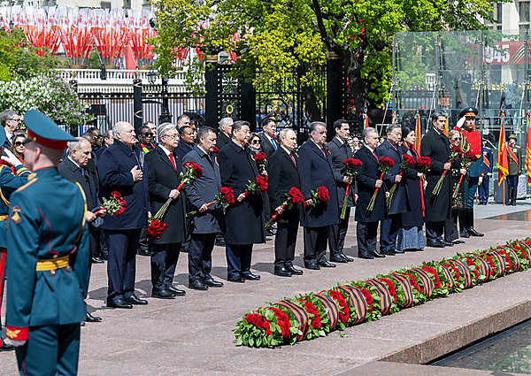 | Chinese President Xi Jinping, along with other leaders, lays flowers at the Tomb of the Unknown Soldier and observes a moment of silence, following the celebrations marking the 80th anniversary of the victory in the Soviet Union's Great Patriotic War in Moscow, Russia, May 9, 2025. [Xinhua/Zhai Jianlan] |
