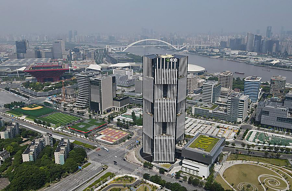 | An aerial drone photo taken on June 17, 2022 shows the headquarters building of the New Development Bank in east China's Shanghai. [Xinhua/Fang Zhe] |