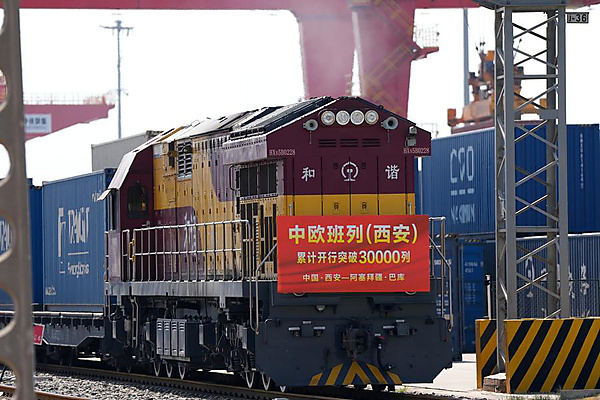 A China-Europe freight train bound for Baku, Azerbaijan, departs from Xi'an International Port Station in Xi'an, northwest China's Shaanxi Province, Aug. 13, 2025, marking a new milestone as the total number of China-Europe freight trains departing from Xi'an since the launch of the first service in 2013 exceeded 30,000. [Xinhua/Li Yibo] |