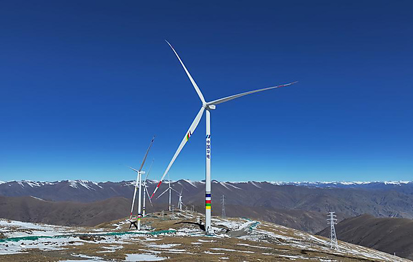 | This photo taken on Nov. 15, 2025 shows a view of a wind farm built by the Xizang branch of Huadian New Energy Group Co., Ltd. in Qonggyai County, southwest China's Xizang Autonomous Region. [Xizang branch of Huadian New Energy Group Co., Ltd./Handout via Xinhua] |