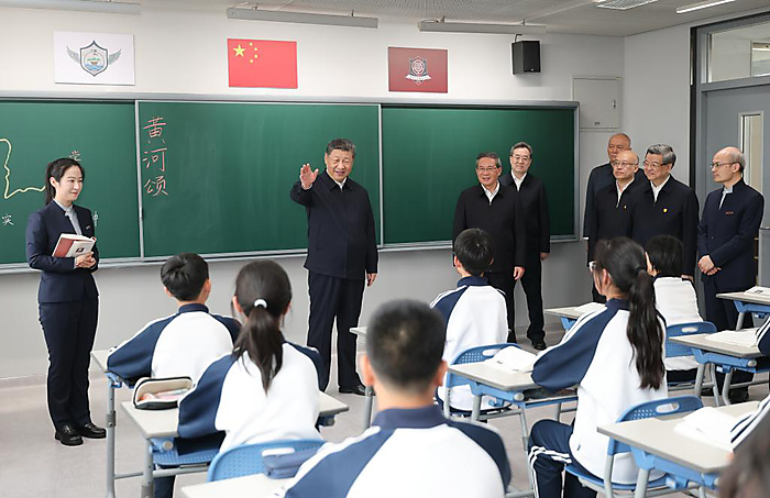 Xi also visited the Xiong'an campus of Beijing No. 4 High School, where he conversed with teachers and students in the classroom to learn about the teaching situation there. In the school canteen, he examined the dining environment and the variety of dishes available.