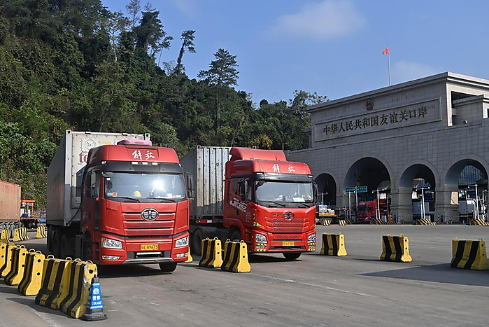 | Vehicles bound for Vietnam are pictured after customs clearance at Youyiguan Port, or Friendship Pass, in Pingxiang City, south China's Guangxi Zhuang Autonomous Region, Jan. 28, 2026. [Xinhua/Lu Boan] |