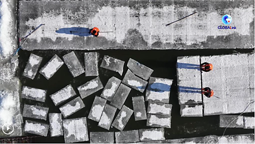 | Workers collect ice at the Harbin section of Songhua River in Harbin, northeast China's Heilongjiang Province, Dec. 9, 2025. [Xinhua/Wang Jianwei] |