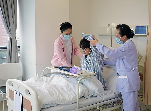 | A nurse (L) and nursing assistant (R) help an inpatient with post-surgery rehabilitation exercises at a hospital in Shanghai, east China, Feb. 26, 2026. [Xinhua/Liu Ying] |