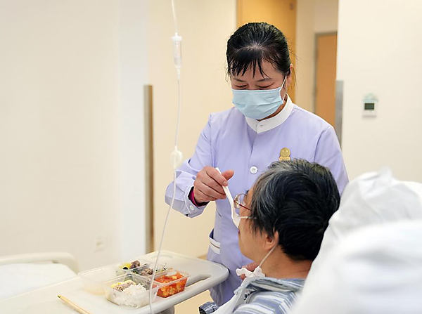 | A nursing assistant feeds an inpatient at a hospital in Shanghai, east China, Feb. 26, 2026. [Xinhua/Liu Ying] |