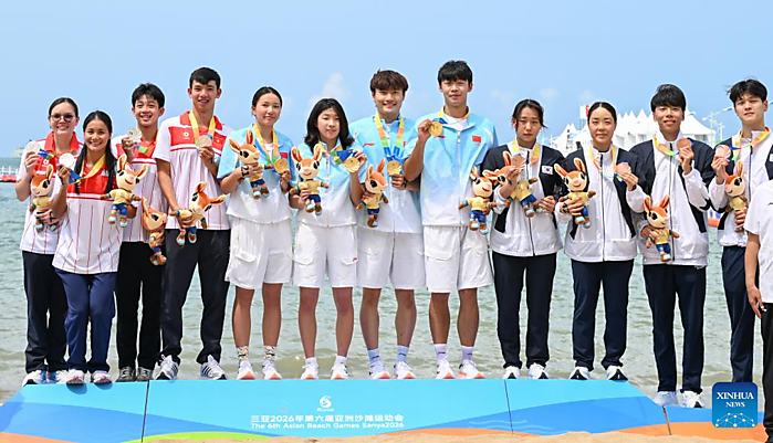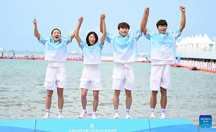 | Gold medalist team China poses for photos during the awarding ceremony of the open water swimming mixed 4x1.5km Relay at the 6th Asian Beach Games in Sanya, south China's Hainan Province, April 27, 2026. [Xinhua/Bei He] |