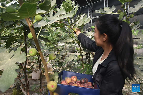 | Li Zifan harvests figs at her tech-driven facility agricultural park in Yingxia Township of Korla City, northwest China's Xinjiang Uygur Autonomous Region, Oct. 11, 2025. [Xinhua/Gu Yu] |