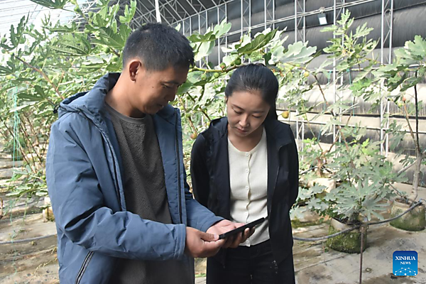 | Li Zifan (R) and a technician check the condition of other greenhouses through a mobile app at her tech-driven facility agricultural park in Yingxia Township of Korla City, northwest China's Xinjiang Uygur Autonomous Region, Oct. 11, 2025. [Xinhua/Gu Yu] |
