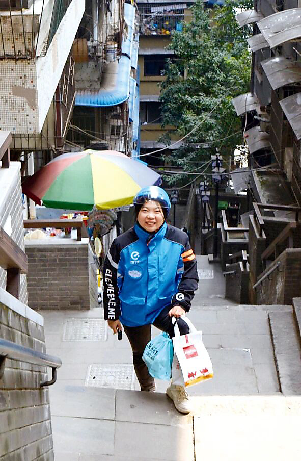 More than six years ago, Liao moved from her home, in northwestern Chongqing's Hechuan District, to downtown Chongqing to find a job. She found a job at a cafe, and she took floral-arrangement classes. "At that time, I concentrated on making coffee and floral designs during the daytime. In the evening, I was curious about those delivery workers, who moved around busily on the streets. I thought it might be a good idea to join them, and to help bring various foods and/or goods to customers," Liao recalls. At a friend's suggestion, Liao became a part-time delivery rider in 2019. One year later, she chose to become a full-time delivery worker. That began her new career path.