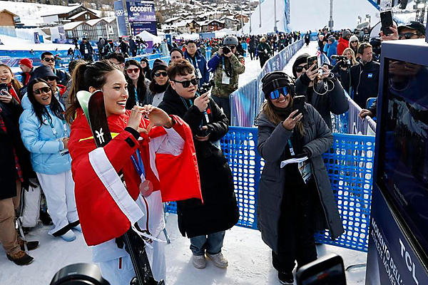 | Silver medalist Gu Ailing (L, front) interacts with the audience. [Xinhua/Wang Peng] |