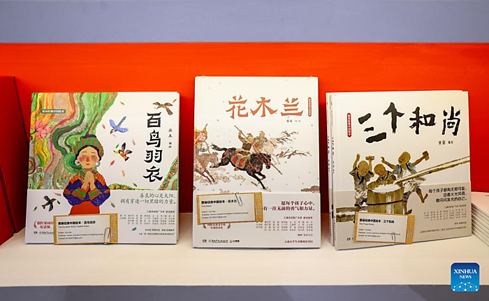 | Photo taken on April 13, 2026 shows books illustrated by Cai Gao on the Bologna Children's Book Fair in Bologna, Italy. [Xinhua/Wang Kaiyan] |