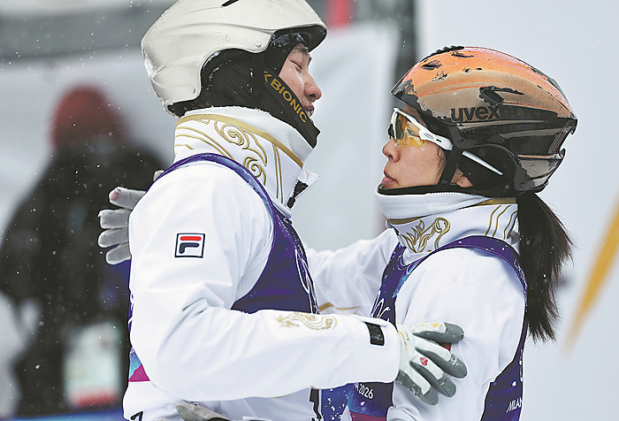 | China's Xu Mengtao (right) and Wang Xindi share an embrace during the freestyle skiing aerials team event at the 2026 Milano-Cortina Winter Olympics in February. The pair went on to add the team bronze to their individual golds. [Xinhua] |