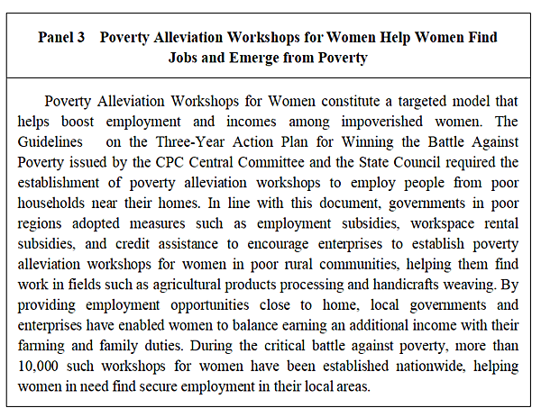 It has strengthened industrial support by facilitating the gradient transfer of labor-intensive industries such as food processing and clothing manufacturing, benefitting 98.9 percent of poor households. By advancing east-west cooperation in labor services, setting up poverty alleviation workshops, and creating public-interest rural jobs, the country has provided job opportunities for poor women with the will and ability to work. In its efforts to alleviate poverty, China has leveraged new forms of business and industries such as e-commerce programs, photovoltaic technology, and tourism to help impoverished women find good jobs within their local communities. In ethnic minority areas, the transition of the hand-knitting business from a purely traditional craft to a driver of the local economy has transformed the lives of the women embroidery artisans in the Miao and Yi communities.