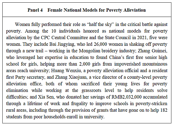 China has organized the largest and most intensive poverty alleviation campaign in human history, benefiting the greatest number of people. By the end of 2020, it had successfully eliminated absolute poverty throughout the country, meeting the poverty reduction target of the UN 2030 Agenda for Sustainable Development 10 years ahead of schedule. On this epic journey of poverty reduction, China has honored its solemn commitment that no one should be left behind, specifically targeting women as a key group to widen their path towards prosperity.