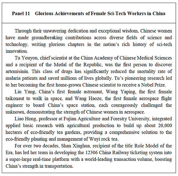 Today, women account for 45.8 percent of all sci-tech researchers in China. They are tackling tough problems and achieving breakthroughs in pioneering fields, overcoming daunting obstacles, and scaling new heights at the forefront of innovation, and making significant contributions to building China into a sci-tech powerhouse with greater strength and self-reliance in science and technology.