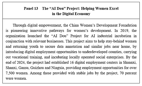 Pursuing excellence in the digital economy. China has issued the Action Plan for Strengthening the Digital Literacy and Skills of the General Public and the Action Plan for Digital Rural Development, which include measures such as carrying out digital literacy education and skills training for women and developing women-led e-commerce brands. Chinese women have answered the call of the digital age, and are committed to developing the digital economy, with 14,147 women obtaining the vocational skills certificates for AI trainers in 2024 alone – comprising 42.3 percent of the yearly total. Women represent over half of the entrepreneurs in the internet sector and about one third of the workforce engaging in new business forms such as digital trade, e-commerce, and live streaming. As the digital economy advances, it is providing more opportunities for women.