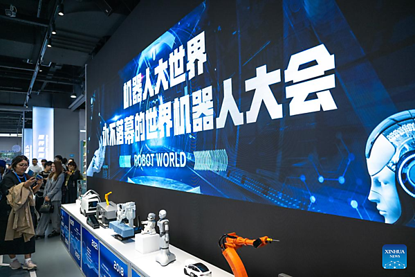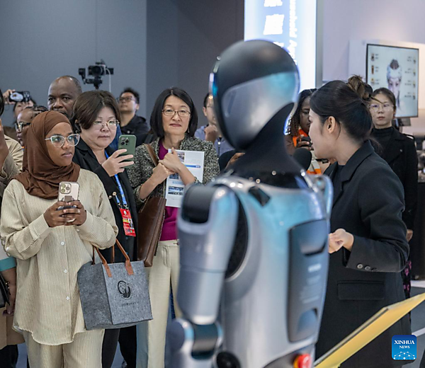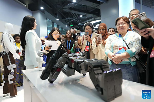 Representatives, who are in Beijing for the Global Leaders' Meeting on Women, watch the demonstration of a robot at the Beijing World of Robots in Beijing, capital of China, Oct. 14, 2025. [Xinhua/Xue Yuge]