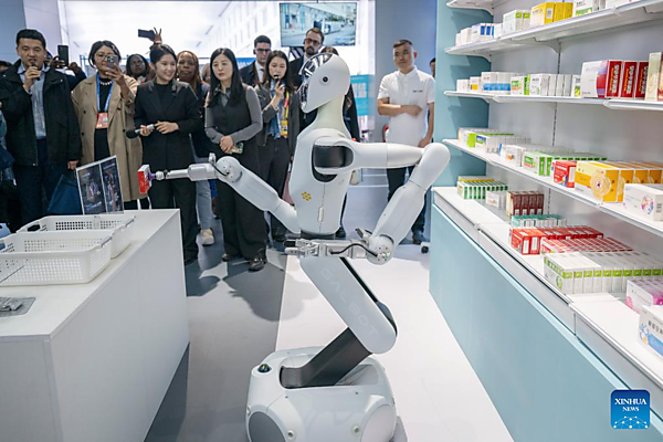 Representatives, who are in Beijing for the Global Leaders' Meeting on Women, watch a robot fetching medicine at the Beijing World of Robots in Beijing, capital of China, Oct. 14, 2025. [Xinhua/Du Zixuan]